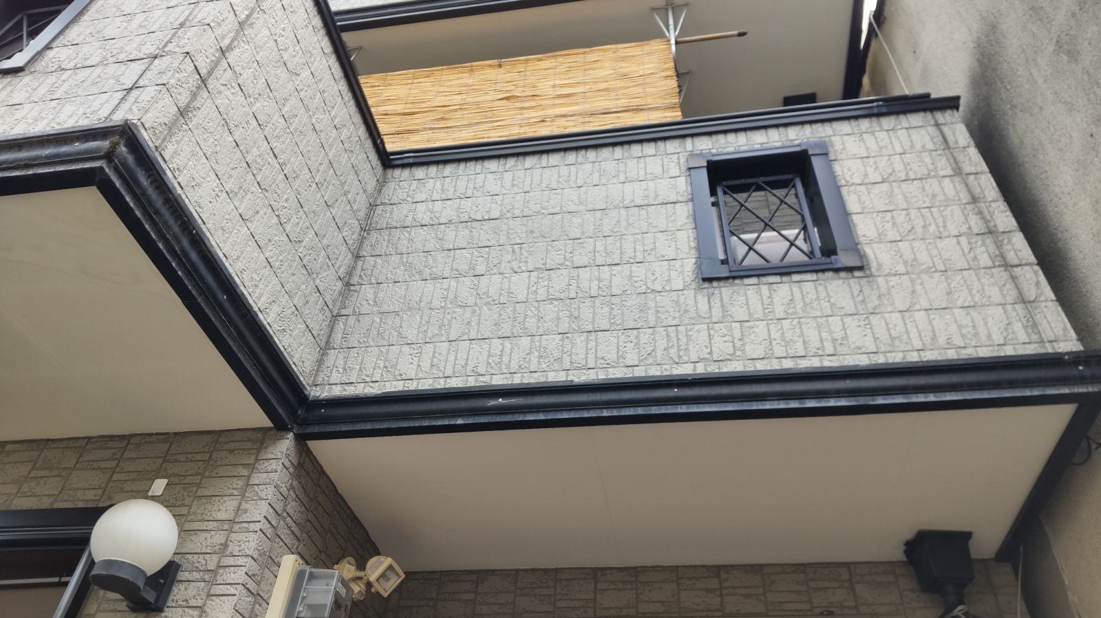 現地に到着後、まず目に留まったのは外壁のシーリング(コーキング)部分の劣化でした。隙間ができ、ひび割れも目立つ状態で、防水性がかなり低下している様子。次に目を向けた屋根には、全体的にコケやカビ、チョーキング(粉状の劣化現象)が発生しており、中心部にはサビ汚れも見られました。このまま放置すれば雨漏りの原因になる可能性も高く、早めの対応が求められます。