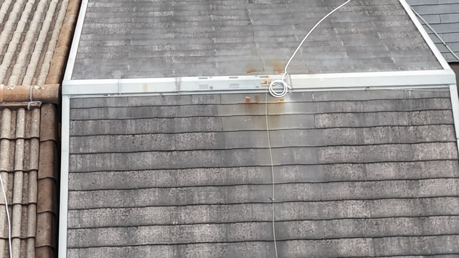 屋根に登って調査を行ったところ、全体に渡って苔の繁殖とチョーキング現象が確認できました。苔や藻が付着すると見た目の悪さだけでなく、水分を吸収しやすくなり、屋根材自体が劣化・腐食するリスクが大幅に高まります。さらに、中央部分には雨だれによるサビ汚れも確認され、金属部分の防水性が失われつつある状態でした。