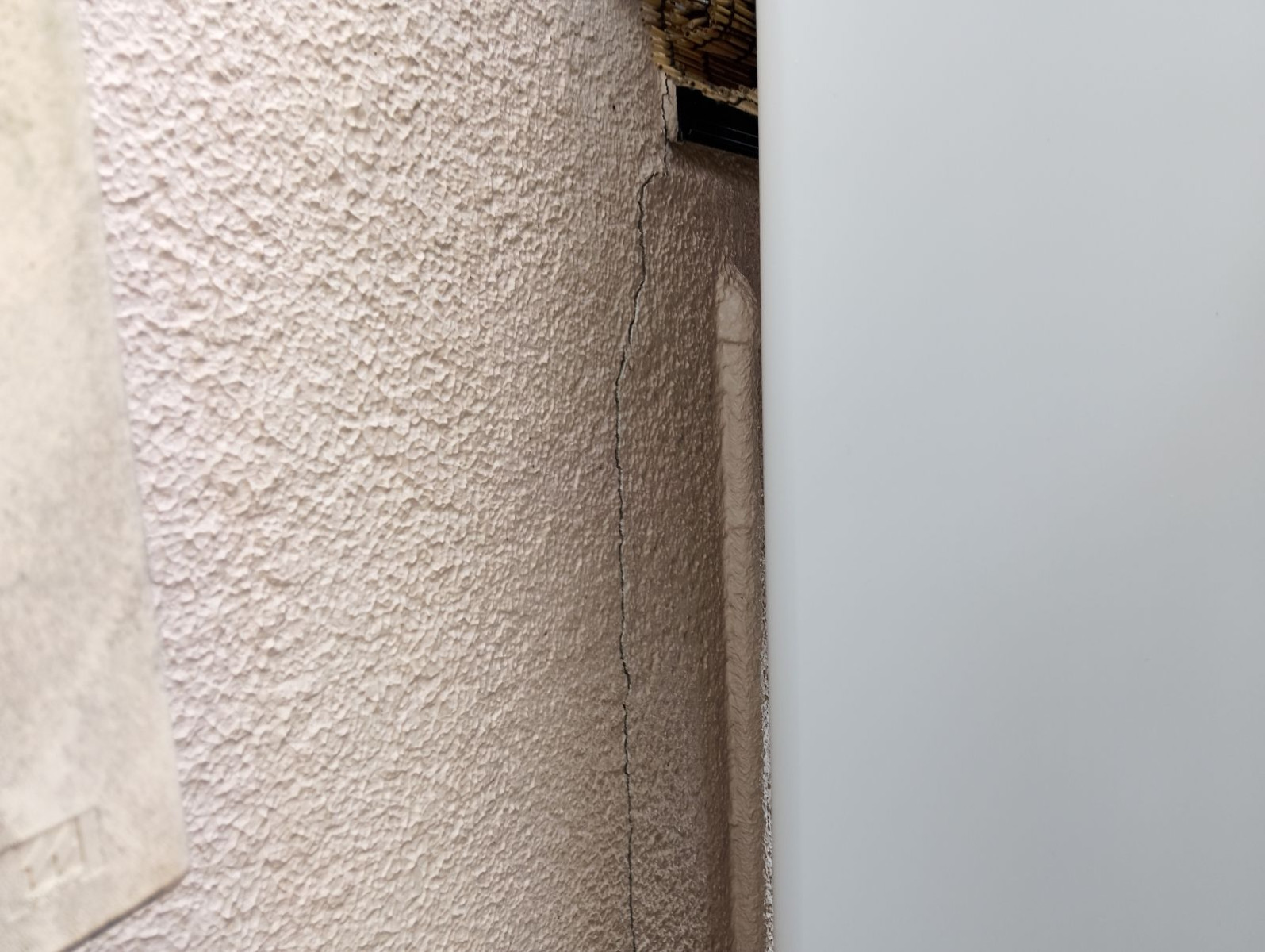 今回の高槻市浦堂本町の現地調査では、特に外壁の劣化が進行している様子が顕著でした。外観上は比較的きれいに見えるものの、近づいてみると細かなヘアークラック(0.2〜1.0mm程度のひび割れ)が複数発見され、放置しておくと雨水の侵入リスクが高まる状態でした。