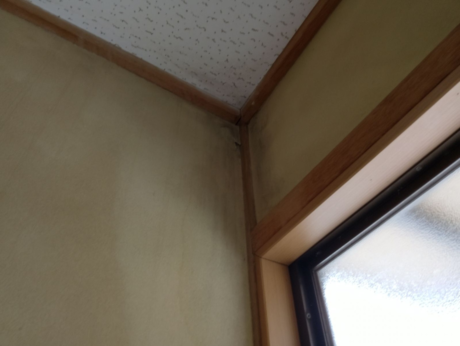 また、室内の写真からは、窓上部のクロス境界にうっすらとしたカビの発生も確認。これは屋外からの雨水侵入が原因である可能性が高いため、外壁や屋根の防水性の低下が影響していると判断しました。
