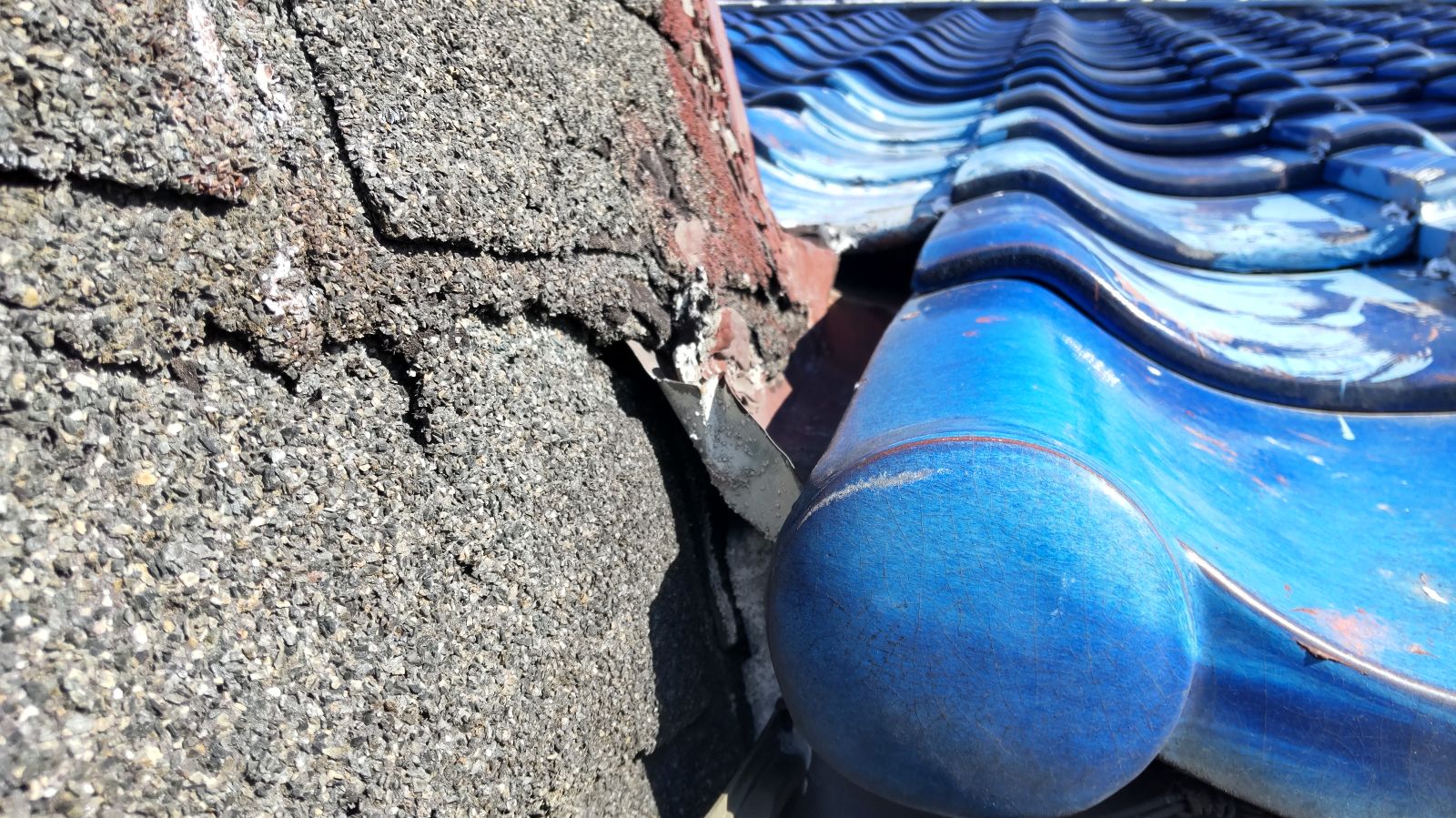 また、瓦そのものにヒビが入っていたり、瓦の重なり部分に泥や苔が溜まっている箇所もありました。これらは雨水の排水を妨げ、雨漏りのリスクを高める要因です。特に問題視されたのが、屋根と外壁との接合部。大きなクラックがあり、そこから雨水が内部に侵入している可能性が高いと判断されました。