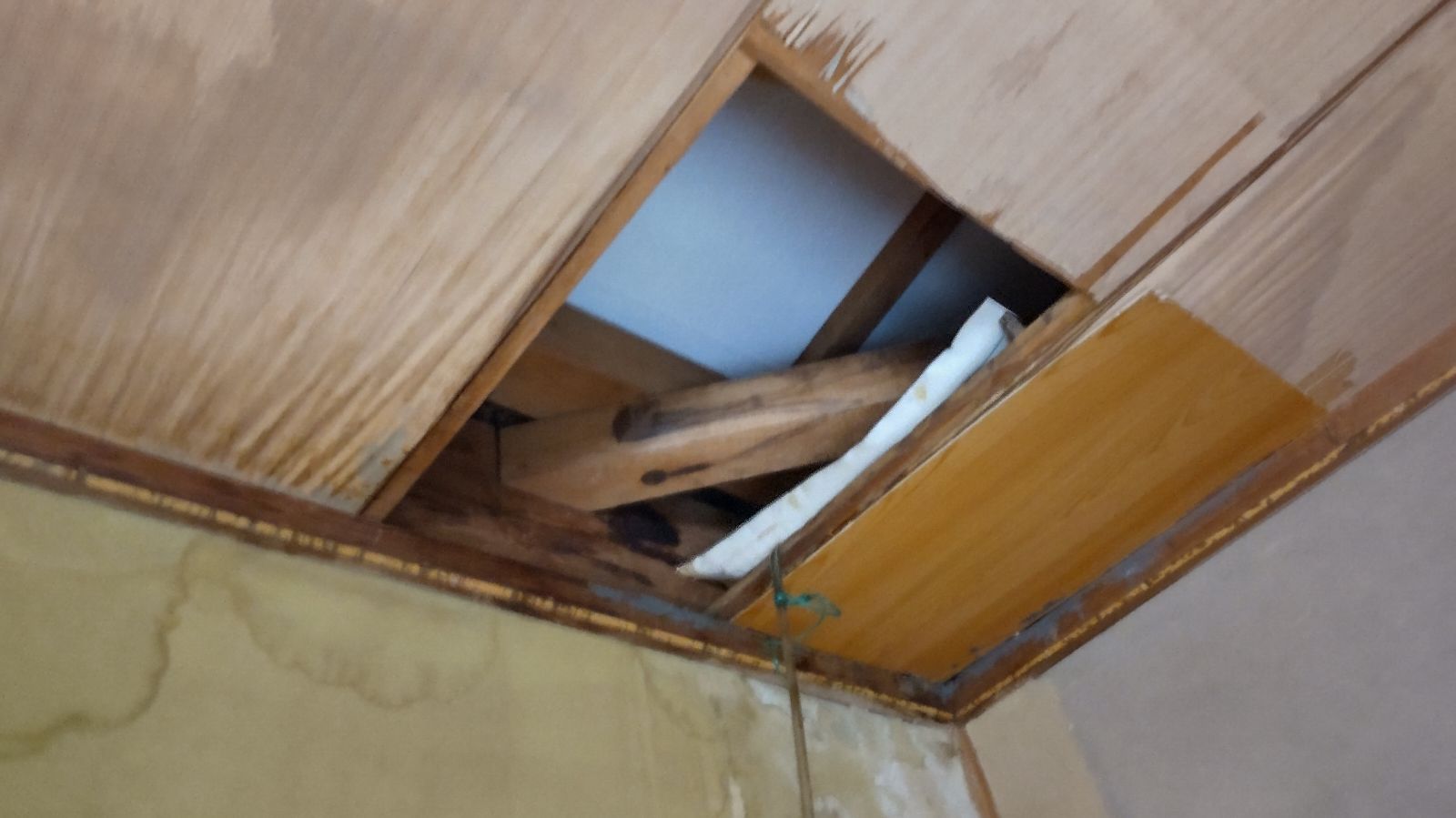 次に屋根部分の確認へ。瓦のズレや破損、棟部分のモルタルの剥離などが確認され、写真にも収めました。特に、隣接する外壁との接合部では、大きなクラックが走っており、雨水の侵入による構造材への影響も懸念されます。実際に屋根裏を点検すると、天井板の一部が開けられており、内部の木材が雨水により変色・腐食している形跡がありました。