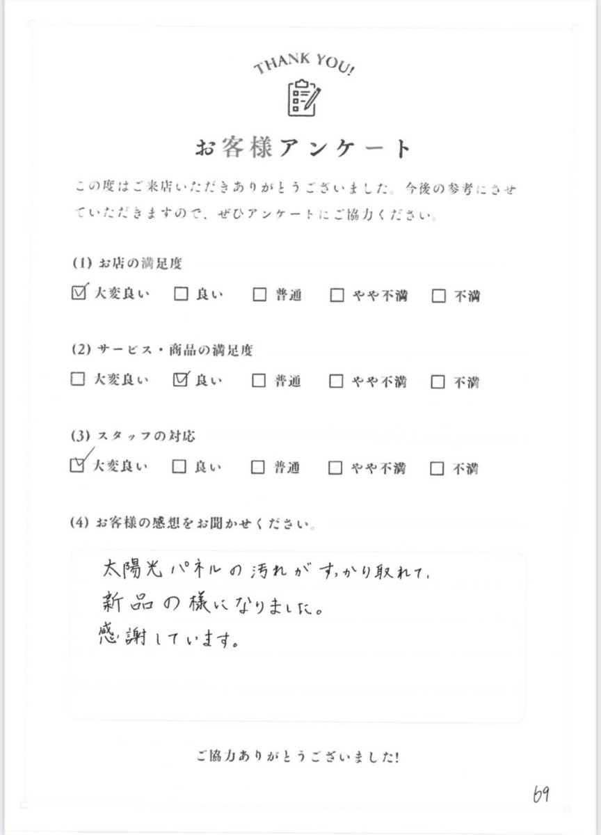 「太陽光パネルの汚れがすっかり取れて、新品の様になりました。感謝しています。」