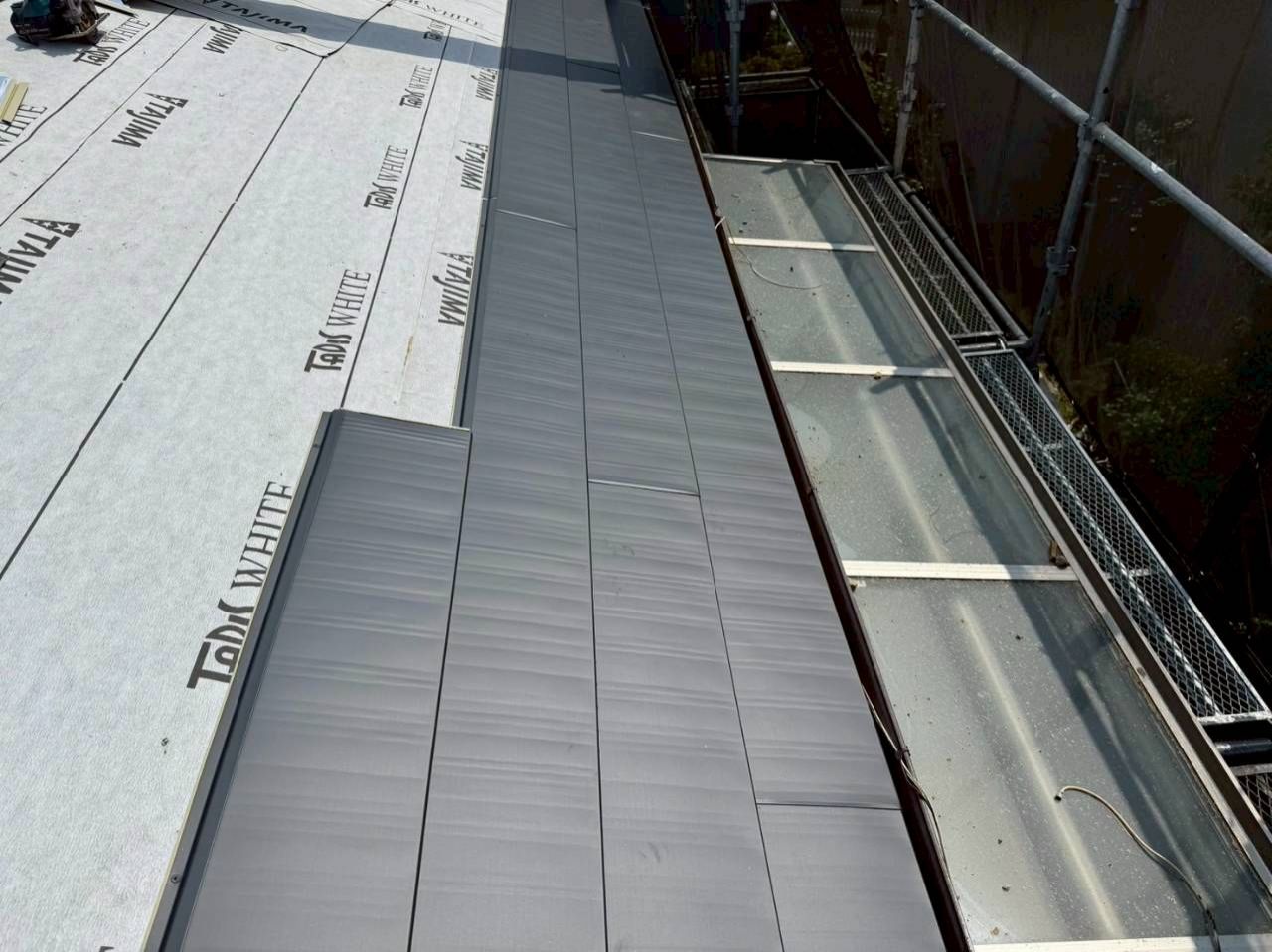 金属屋根ならではのシャープで美しいラインが通るよう、細かな調整を加えつつ丁寧に施工しました。