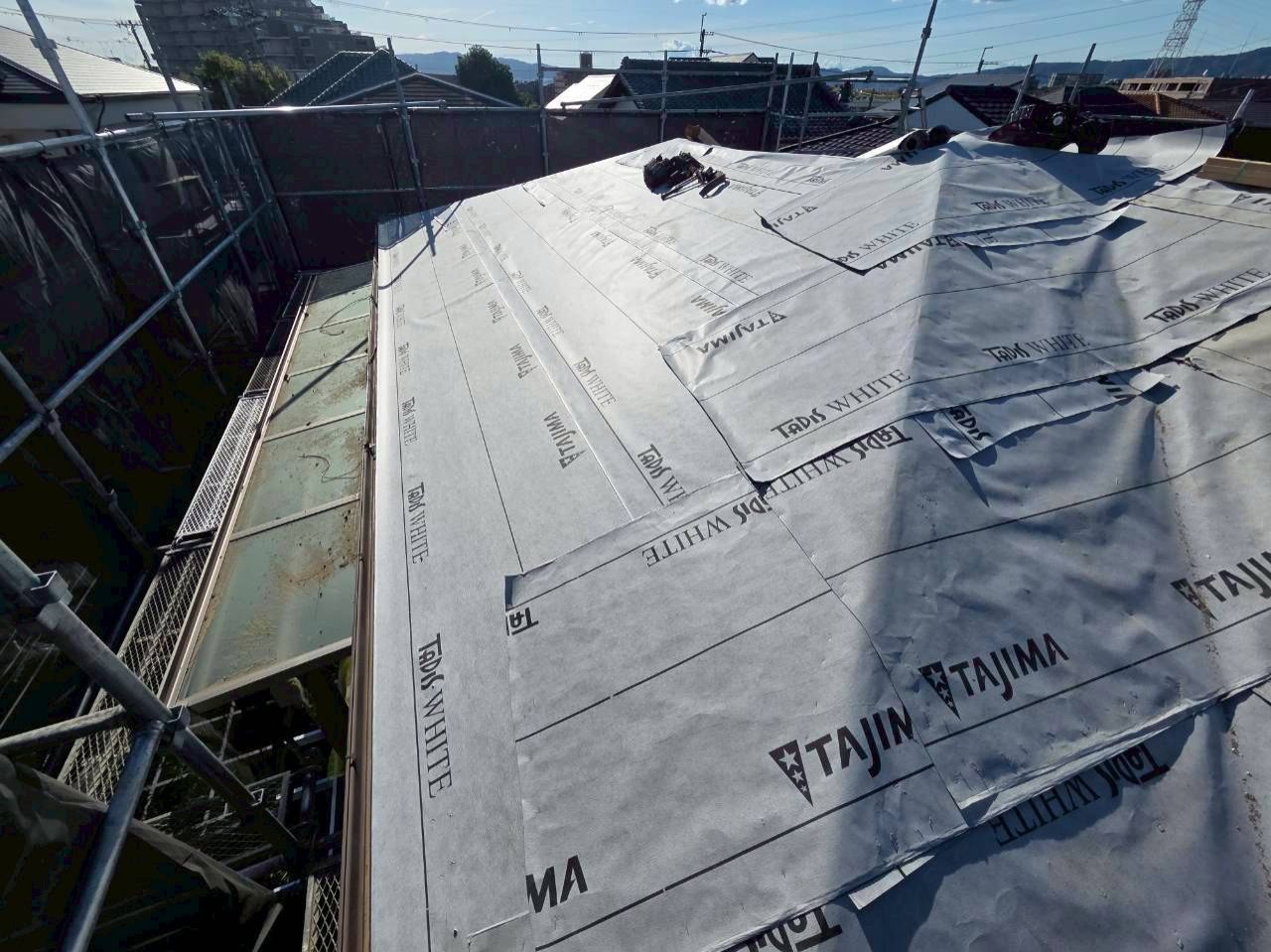 下地が整った後、屋根全体に**高耐久の防水シート(TAJIMA製ルーフィング)**を張り込んでいきます。